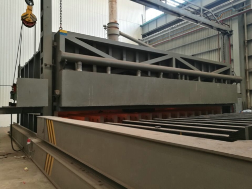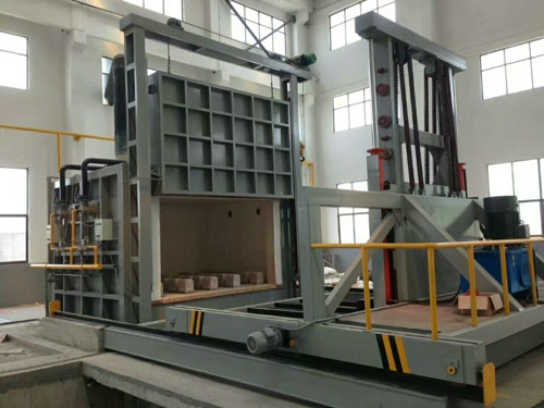 專用叉車設置于爐門前,具有獨立的軌道及傳動裝置,承載工件進出及升降的裝置(爐門前淬火水池深2米),起降范圍:+1米,-2米,材質為Q235,叉車全部采用機械結構,主要由移動機架、鏟腳組合而成,自動叉車能在45s內將工件移入淬火池內。